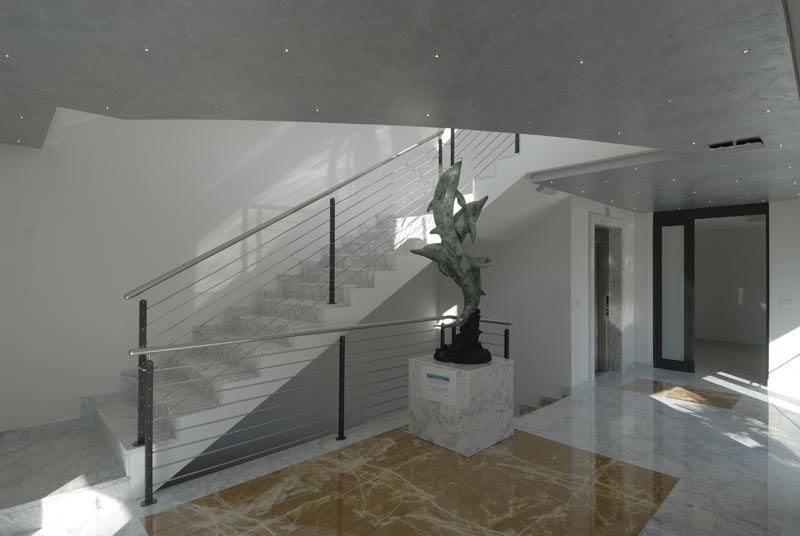 Scale in marmo Bianco Carrara e pavimento in Onice Miele lucidati